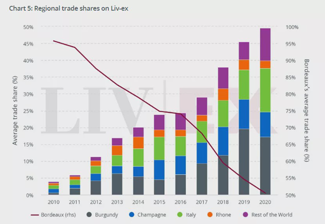 一些新的區(qū)域如布魯奈羅、巴羅洛、香檳也吸引著買家的注意。今年到目前為止,波爾多葡萄酒的貿(mào)易份額為51%,勃艮第17%,意大利13%,香檳7%,羅納河谷2%。世界其他地區(qū)的葡萄酒價(jià)格已經(jīng)從最近的平均5%上升到10%,部分原因是受到了來自新世界的免稅葡萄酒的推動(dòng)。