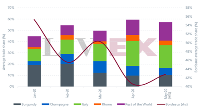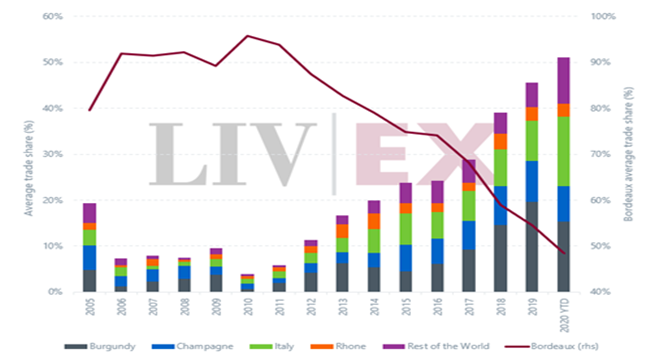 長期以來,勃艮第一直是波爾多衰落的主要受益者。 去年,該酒區(qū)的交易份額更創(chuàng)歷史新高 – 全年平均高達20%。 然而,本年至今,這數字已跌至15%。 在《高峰后的勃艮第》的專題報告中,我們已詳細探討了出現(xiàn)這變化的背后因素。