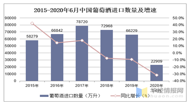 2015-2020年6月中國葡萄酒進口數量及增速
