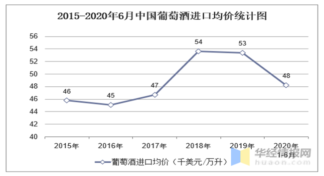 華經產業研究院數據顯示:2020年1-6月中國葡萄酒進口數量為22909萬升,相比上年同期減少了10638.1萬升,降幅為31.7%;進口金額為1105486千美元,相比上年同期減少了588716千美元,降幅為34.8%;2020年1-6月中國葡萄酒進口均價為48.26千美元/萬升。