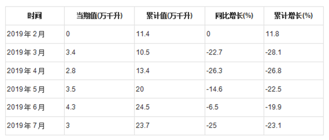 2019年1-7月全國葡萄酒產量分月數據