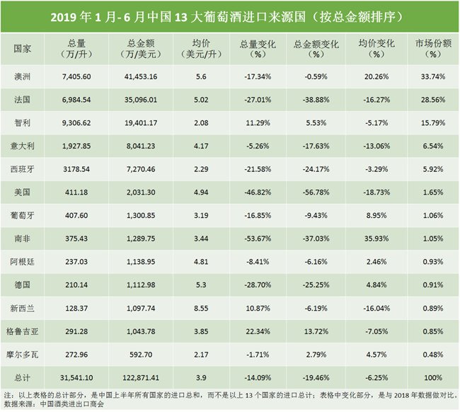 中國(guó)酒類進(jìn)出口商會(huì)(China Chamber of Alcohol Importers and Exporters)公布了 2019 年 1 月- 6 月中國(guó)的 13 大葡萄酒進(jìn)口來(lái)源國(guó)及相關(guān)數(shù)據(jù):